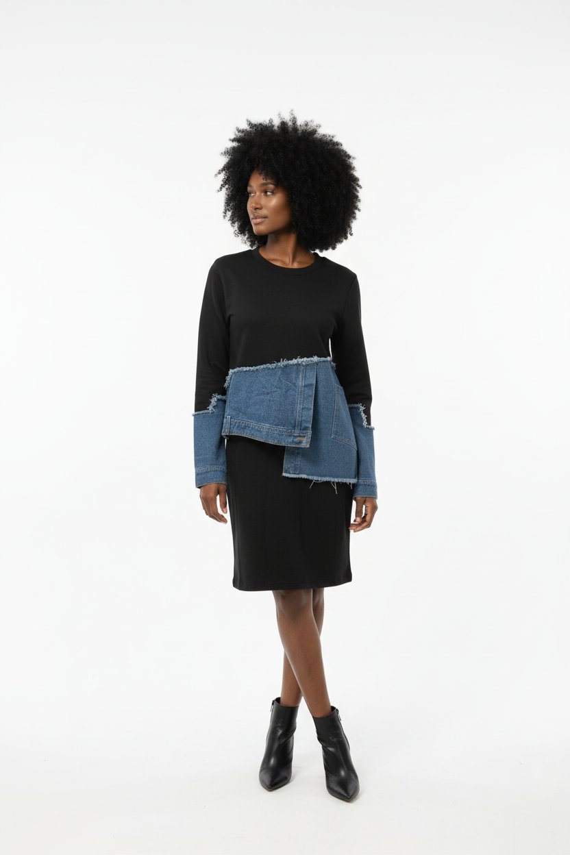 Split denim and black top. Black Dress not included